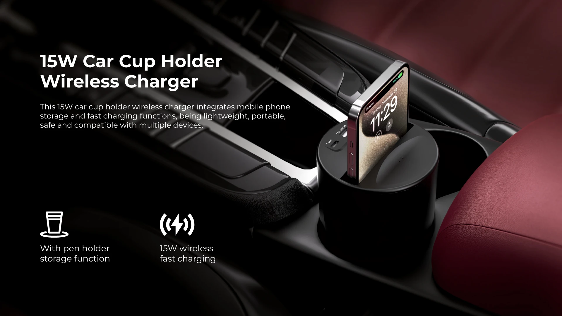 Smart Cup Style Car Charger Fast Wireless Charging, Anti-Slip Design, Dual QC3.0 Ports OEM/ODM Support